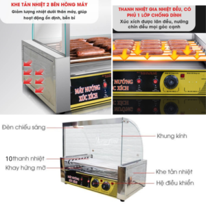 - 10 thanh lăn (thanh nhiệt) được phủ 1 lớp chống dính giúp cho xúc xích không bị dính vào trục. Tuy nhiên, khi quay bạn nên phết qua 1 lớp dầu ăn để xúc xích căng bóng và xoay đều dễ hơn.